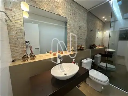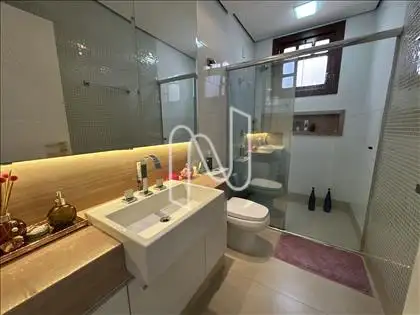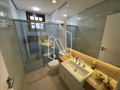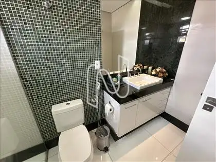 - Banho social revestido em porcelanato, com box em vidro temperado, bancada em granito e armários planejados;