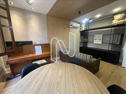 - Sala de TV com piso em madeira;